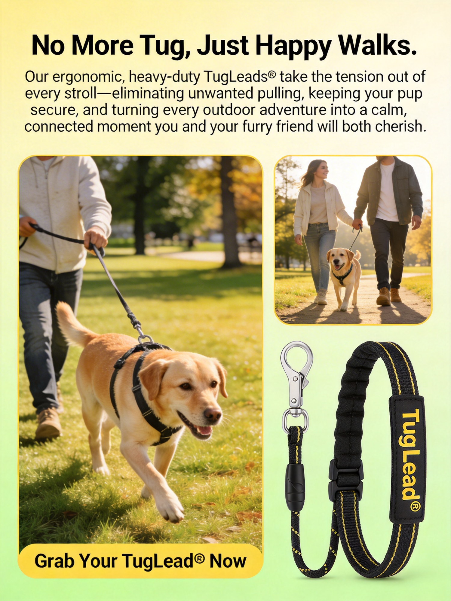 No More Tug, Just Happy Walks. Our ergonomic, heavy-duty TugLeadsĀ® take the tension out of every strollāeliminating unwanted pulling, keeping your pup secure, and turning every outdoor adventure into a calm, connected moment you and your furry friend will both cherish. Grab Your TugLeadĀ® Now